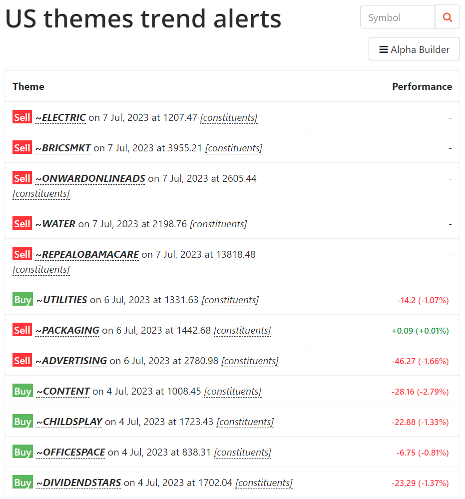 Theme Alerts is a tool within Alpha Builder that provides trends of themes in the US market. It allows users to stay updated on the latest trends and movements of investment themes. The themes are displayed in chronological order of trend start date.